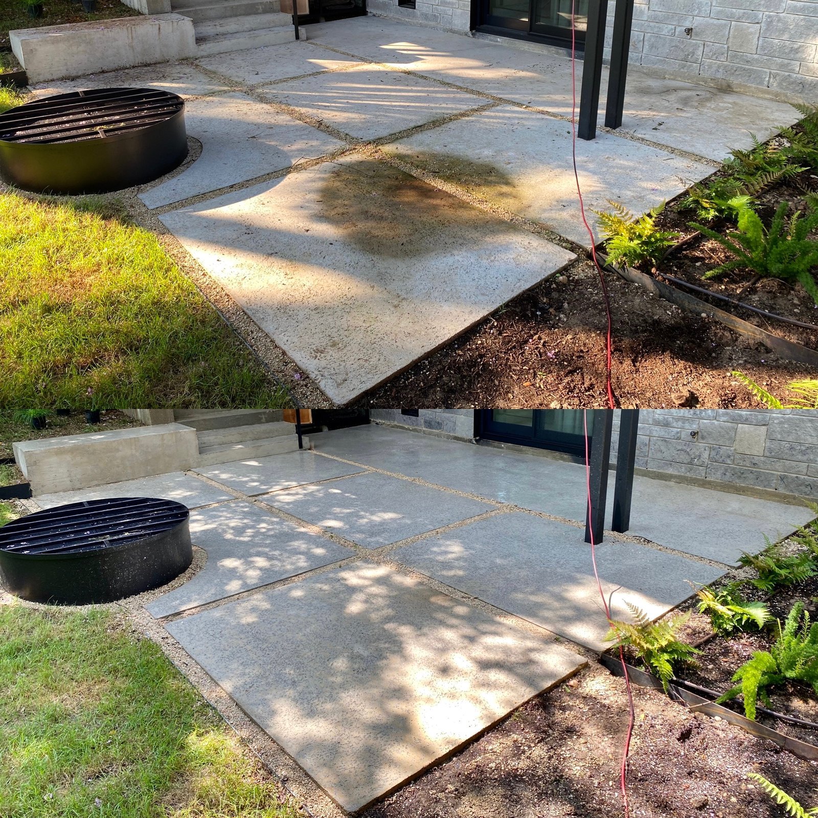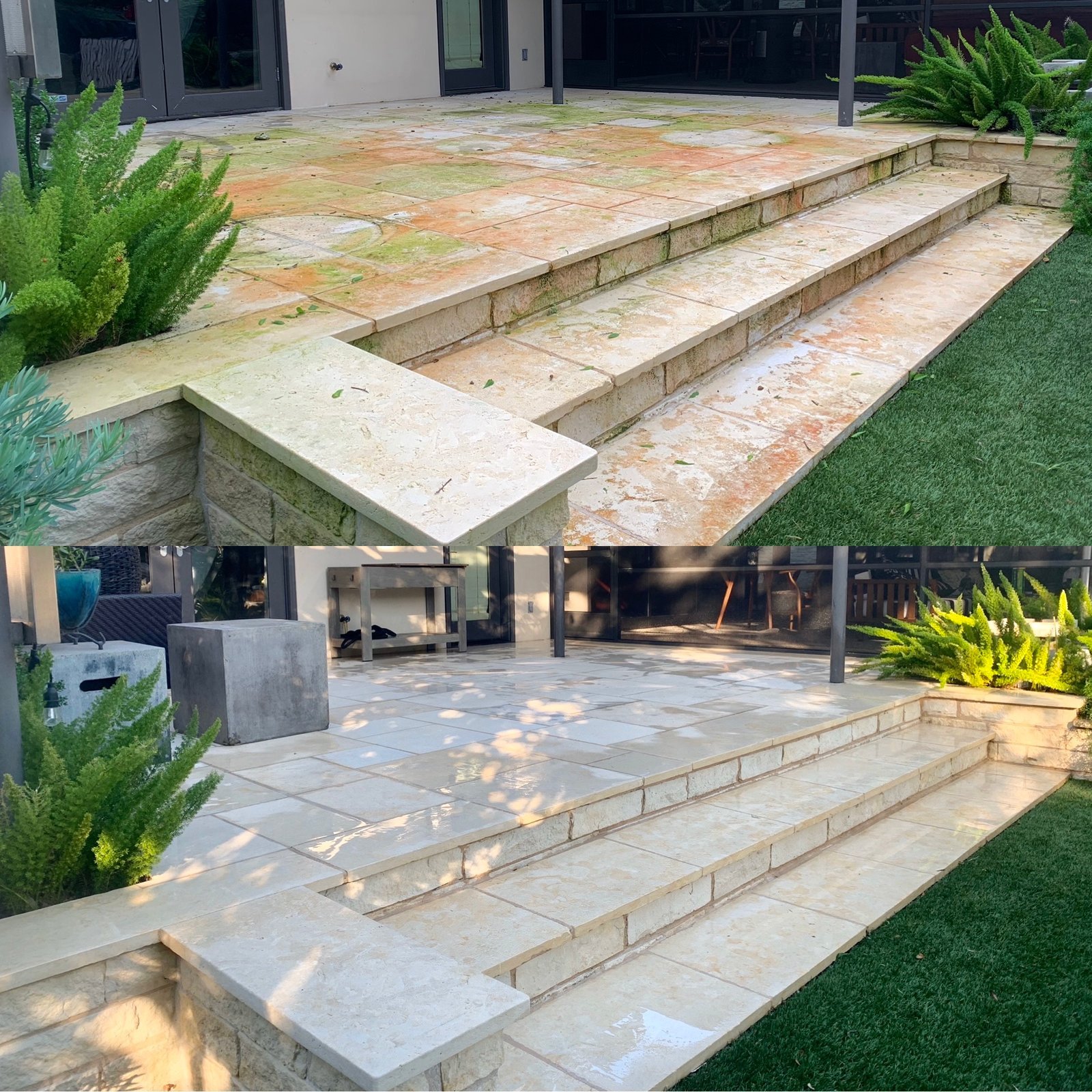 The cleaning was effective, but the strong chlorine smell lasted three days, contradicting the "eco-friendly" claim. Despite pre-watering, some plants are dying, and the metal flashing on the porch roofline is now streaked and faded, likely from high-pressure spraying or chemicals. The crew was professional and courteous.